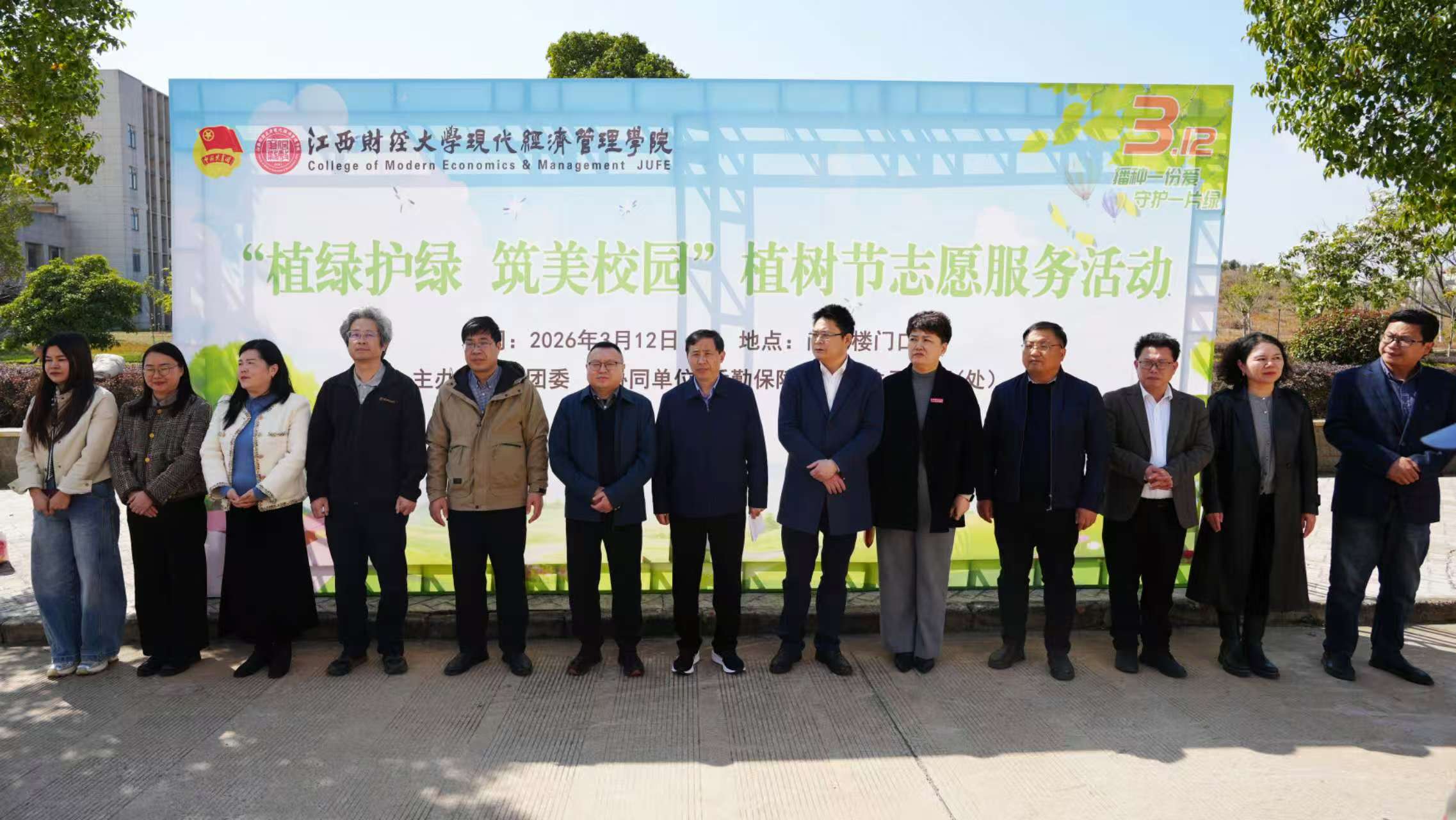 春风送暖,绿意萌动,2026年3月12日植树节当日,江西财经大学现代经济管理学院“植绿护绿·筑美校园”植树节活动在尚智楼门口顺利开展。