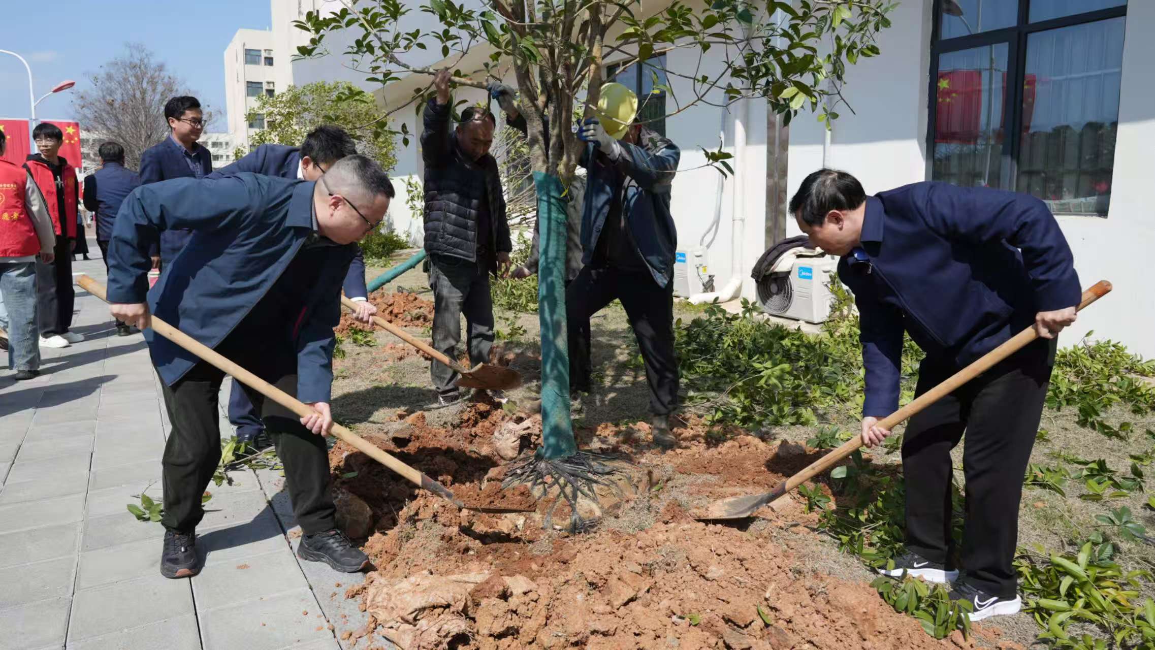 致辞结束后,现场植树环节有序开展。参与人员热情高涨、分工协作,挥锹铲土、扶苗定根、填土压实、提水浇灌,每一个步骤都一丝不苟。大家齐心协力,将一棵棵新苗栽种入土,嫩绿的树苗在春风中挺立,为校园增添了勃勃生机,也凝聚起师生共建绿色校园的满满合力。